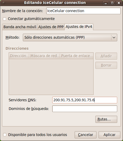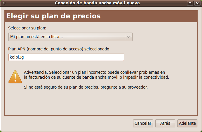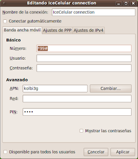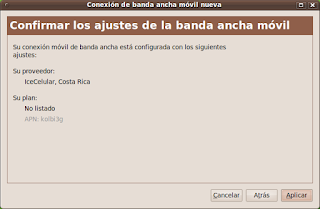 En la siguiente captura se ve donde ingresamos el APN (Access Point Name), en Costa Rica, los planes actuales del ICE usan el APN: "kolbi3g" sin comillas.