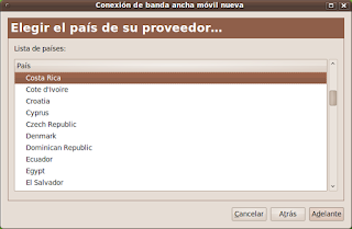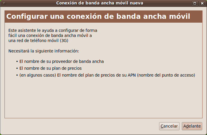 Conectamos el MODEM USB a un puerto libre de nuestra PC, luego vamos al icono de "Network Manager" (El de conexiones de red) y elegimos "Conexión móvil de banda ancha (GSM) nueva". A continuación adjunto las imágenes donde se aprecian los pasos necesarios para configurar la conexión.