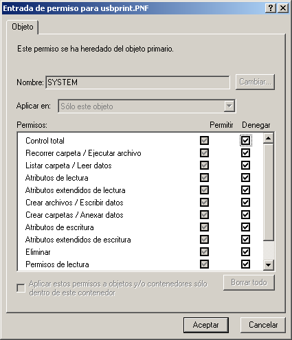 Paso 5: Como se puede observar ahora hay una nueva entrada de tipo "Denegar" y que dice "no heredado"