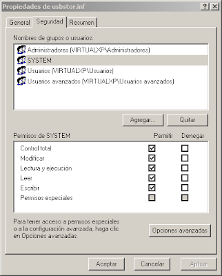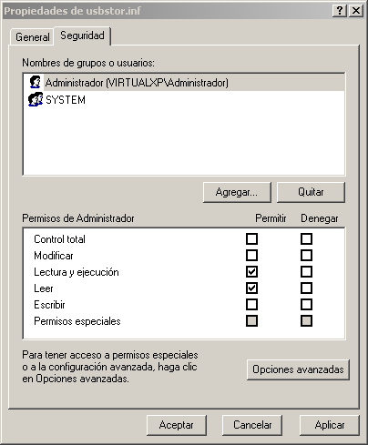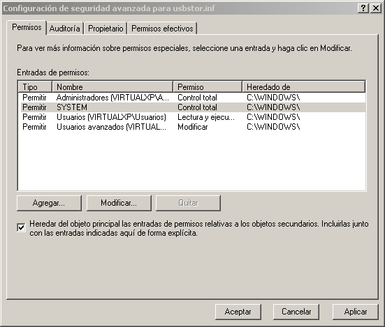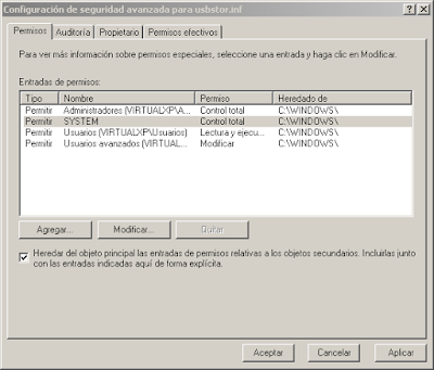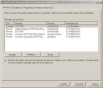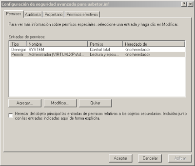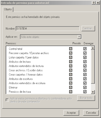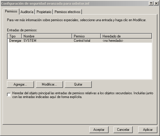 Paso 9: Así se ve el cuadro de dialogo "Configuración de seguridad avanzada para usbstor.inf" una vez que le hemos denegado el permiso al usuario "System" y al usuario "Administrador"...