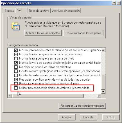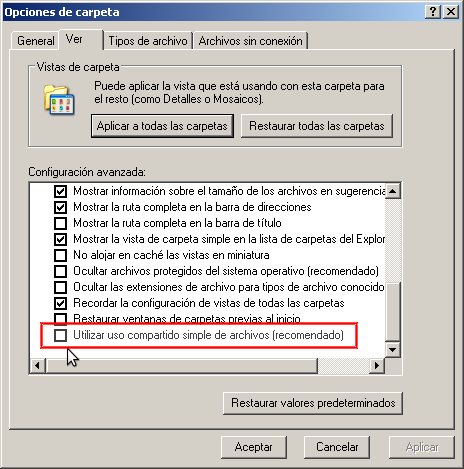Paso 1: Habilitar la ficha seguridad. Para hacerlo verifique que esté desmarcada la opción de "Utilizar uso compartido simple de archivos" en el cuadro de dialogo "Opciones de carpeta".