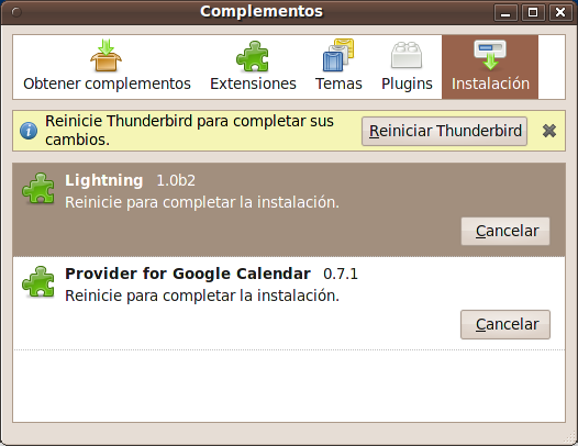 Entonces abrimos el menú "Herramientas", "Complementos", hacemos clic en botón "Instalar", en el cuadro de dialogo que se abrirá buscamos las extensiones descargadas y las agregamos una a una. Teniendo el cuidado de agregar primero "Lightning" y luego "Provider for Google Calendar", reiniciamos Thunderbird luego de instalar las dos extensiones.